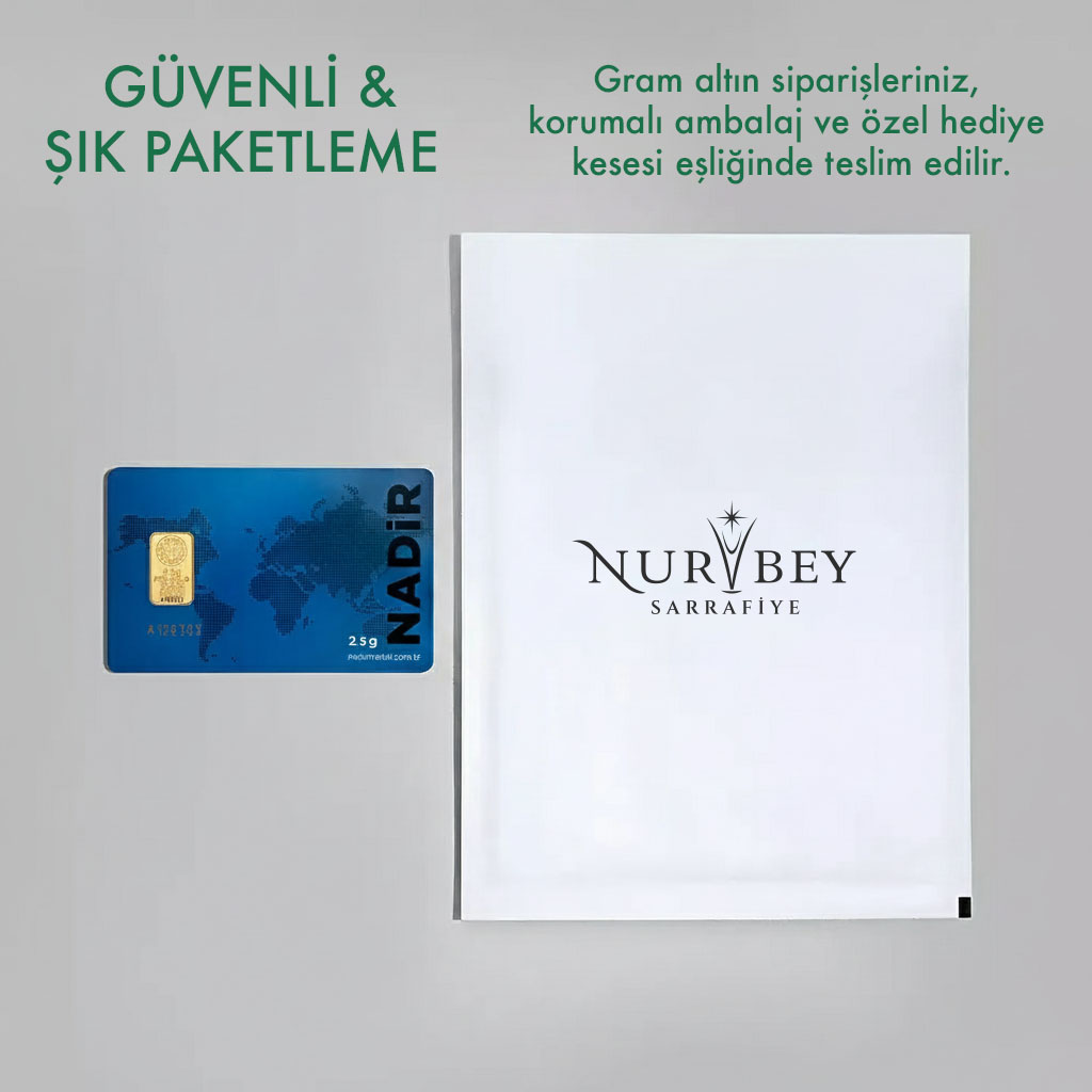 Nurbey Kuyumculuk tarafından sunulan 24 ayar, 995.0 saflığa sahip yatırımlık gram altın; sertifikalı, kontrol edilmiş ve sigortalı şekilde gönderilir. Ürün görselleri temsilidir; marka stok durumuna göre değişebilir. Fiyatlar güncel altın piyasasına göre belirlenir ve siparişler kesin niteliktedir. Güvenli, hızlı ve prosedürlere uygun teslimat sağlanır.
